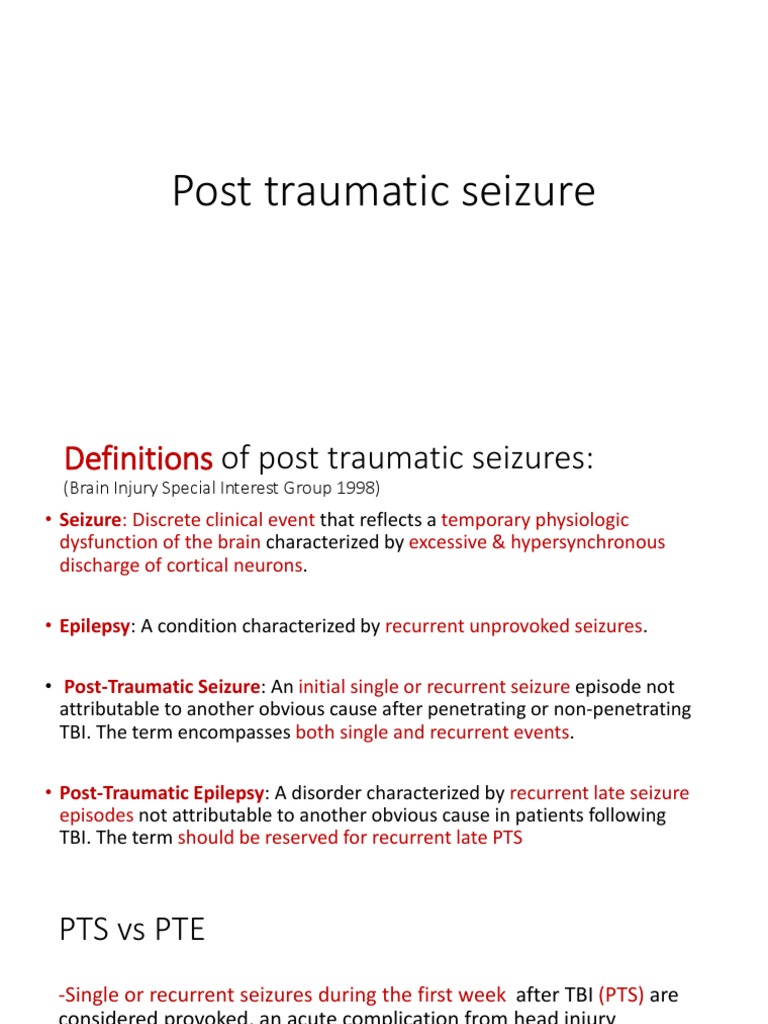 The results of this study may be limited in that 167 of the individuals did. Seizures due to post-traumatic epilepsy are differentiated from non-epileptic post-traumatic seizures based on their cause and timing after the trauma. What do we call seizures after TBI A seizure that occurs within 1 week of a TBI is called an early posttraumatic seizure.
