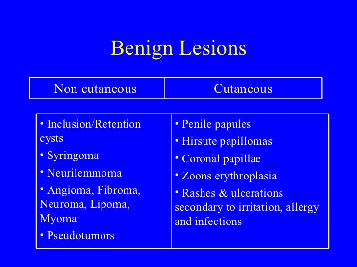This lesion occurs as small papules or macules sometimes annular on the glans or shaft and may be mistaken for pemphigoid or erythema multiforme. One of the most benign and most harmless types of penile lesions are pearly penile papules. The management of benign noninfectious penile lesions usually involves observation topical corticosteroids or topical calcineurin inhibitors.